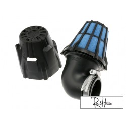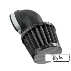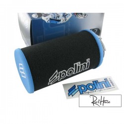 Polini EVOLUTION air filter. About 20 cm long and with two layers of special foam with different pore sizes. Ultimate racing optic and high air flow. 90° connection with a connection size of 38 mm; unfortunately it's quite loose with 17-21mm carbs. This air filter should only be used if there is not enough room for air filters with straight connection,...