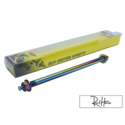 Electroplated front wheel axle by NCY for Ruckus. . Has safety wire / cotter pin provisions (2mm)! Dimension : 12mm X 250mm. Attention, does not fit OEM forks!