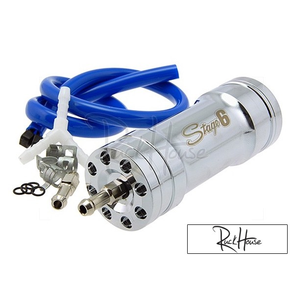 While the Malossi Boost Bottle is intended for 125-250cc engines, this one from Stage6 is especially designed for 70cc engines. Like the Doppler version, it has a solid chamber, which prevents the airstream from oscillating back and forth through the carb's venturi when throttle is lowered, hence the airstream is only charged with fuel once which improves pick-up when throttle is opened. This way your scooter also will have less problems with an overly rich mixture and it adds up to lower fuel consumption and better throttle response. Highly recommendable with a big bore carb, which often can have problems with a rich mixture at lower revs. Comes with all the small parts needed for fitting and is available in chrome and blue anodised.