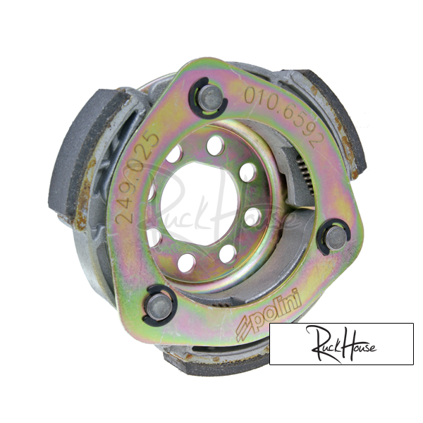 Polini Maxi Speed clutch for Piaggio maxi scooter engines. This clutch features great design together with lightweight clutch blocks and reinforced friction plates. Altering the speed at which the clutch engages means the engine can be made to rev higher before the power comes in. This means greater drive, better performance on hills, everyday use and traffic light getaways. The clutch cannot be additionally adjusted, you can achieve this variation in engagement speed with different clutch springs.