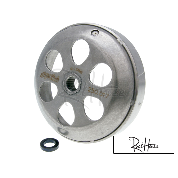 Reinforced Polini maxi speed clutch bell. The reinforced outer ring ensures a lack of distortion and thus better durability. Ideal for use in combination with the Polini clutch, but fine with the original clutch set up. Discoloured and misshapen clutch bells mean poor power delivery, drive and a lack of torque. The drive system then runs with ever more worn clutch plates and if you wait too long, you will have to replace the entire clutch. Replacing the clutch bell in this case is the only option.