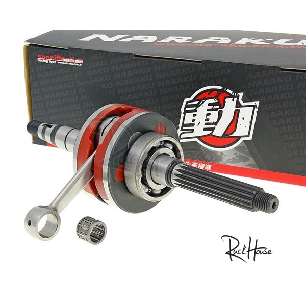 Naraku heavy-cheeked HPC racing crank increases the pre-compression in the cases for improved filling. The extra inertia improves performance and the performance moves to the upper rev range. The crank design, with plastic inserts, only slightly increases the mass over the original making it ideal for 50cc. Delivery includes small end bearing for 12mm gudgeon pin, 16mm crankshaft output shaft.