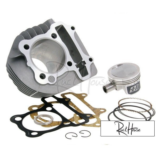 160cc Big Bore Kit for GY6 based 125/150cc + engines. The bore is 58.5 mm. The kit is compatible with all air-cooled 4-stroke 125-150cc Kymco engine (Scooter) and most Chinese import 125/150cc Scooter, Quad and Buggies. This cylinder kit can be used with the original cylinder head. For those who want even more, there is a camshaft with modified timing. The highlight of this Naraku cylinder kit is the forged pistons, which offer better durability and reduced friction. The raised piston skirt also ensures higher compression. Supplied as shown. Attention : No Boring Required!