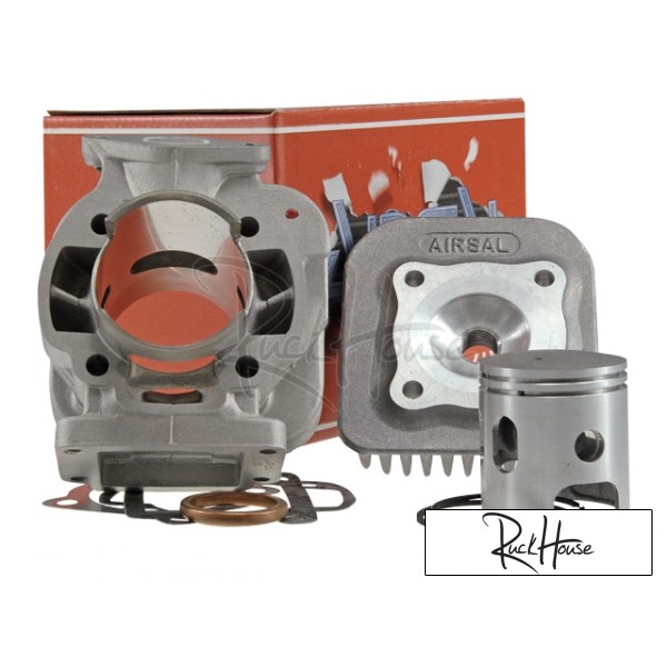 With the Airsal 70cc, you get an aluminium cylinder for the same price that would normally buy you a common cast-iron cylinder. It has a hardened chrome-nikasil bore, and due to the fact that it is made of aluminium it has better heat dissipation properties than the cast-iron version so that piston seizures are a lot less common. Unfortunately, high top speeds and huge hps are not the strong points of the Airsal cylinder. However, it has an even torque development and already high power at low revs, which definitely makes it interesting for some riders. Works fine with original and touring exhaust systems.(10mm gudgeon pin)