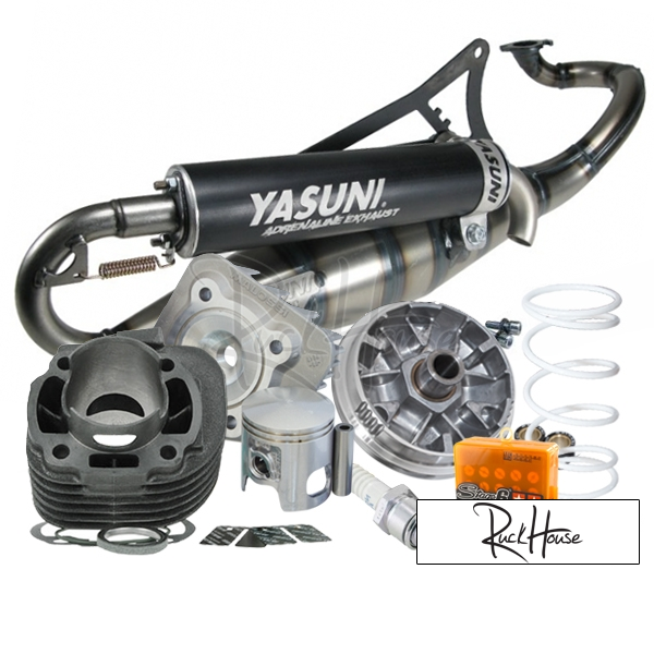 Complete engine package for Yamaha Bws 2002-2011. Package include Malossi Sport 70cc cylinder kit, Variator Malossi multivar, Exhaust Yasuni R, Main jet set 80-102 6mm, Spark plug BR9HS, Malossi 16x13 7.0g roller and Malossi white torque spring (Soft).