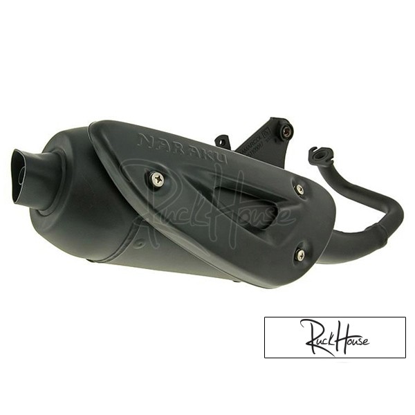 The homologated Naraku Traffic system combines a modern, fresh design with pleasant sound. This design adapts wonderfully to new outfits of modern scoots. Even when combined with current futuristic bodies, it doesn't seem oldfashioned and is thus more than just an inexpensive replacement exhaust. The Naraku Traffic offers more than good looks, though. Without restriction, the resulting torque and power delivery count among the best in its class. The very wide rev range makes adjusting easy. The exhaust comes with a reduction bush in the downpipe, with which its performance corresponds to that of the original pipe. The systems have e-markings so that they can be used on public roads. Removing the reduction bush results in more power, but also voids the homologation. The exhaust system is ideal in conjunction with 50cc original or 70cc sport cylinders.