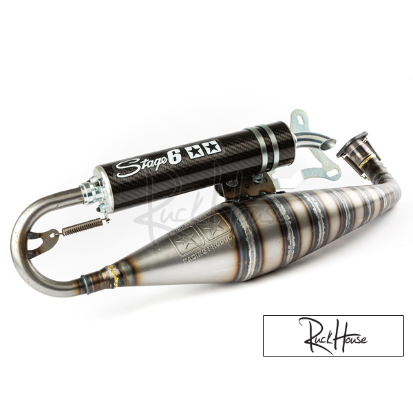 The MKII version of the Stage6 R1400 exhaust features a completely new design and an optimized expansion chamber to fully exploit the performance potential of modern cylinders that in the meantime have even more power. The basic elements remain the same - the exhaust is diligently welded by hand from thin sheet steel cones, complemented by a carbon silencer which, while clearly conveying a racing look, remains unobtrusive. Like its predecessor, the Stage6 R1400 comes with a race finish, i.e. it is unpainted; we recommend to oil the exhaust regularly to protect it against rust. In terms of performance the R1400 MK2 is an excellent match for 70cc high-end racing cylinders such as the Stage6 MKII, Malossi MHR Team 2, 2Fast 70cc, etc. Definitely a must-have for real tuning freaks and racing fans!