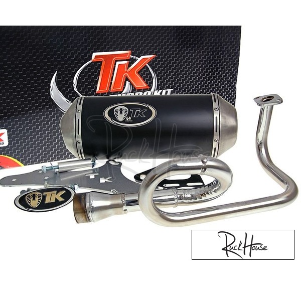 Among insiders, the Turbo Kit name is synonymous with peak performance. The GMax Scooters exhaust is a new product, which combines everything that a 4-stroke Scooters rider could ever desire. Maximum power, muffled, unobtrusive sound, stainless steel / aluminium construction, great looks, outstanding value for money and everything absolutely road legal thanks to E-certification. The silencer is equipped with a silencer (Noise Killer). These can optionally be removed by removing the retaining ring. The sound patterns are thus significantly altered, but removal invalidates road legal status. The snap ring securing is more advantageous than a conventional screw fastening. Screws vibrate, come loose and then you lose the Noise Killer. The, at first, strange looking outlet port flow helps noticeably increases torque. In Turbo Kit comes with all the necessary hardware included. Fits GY6 4-stroke 50cc Scooters China.
