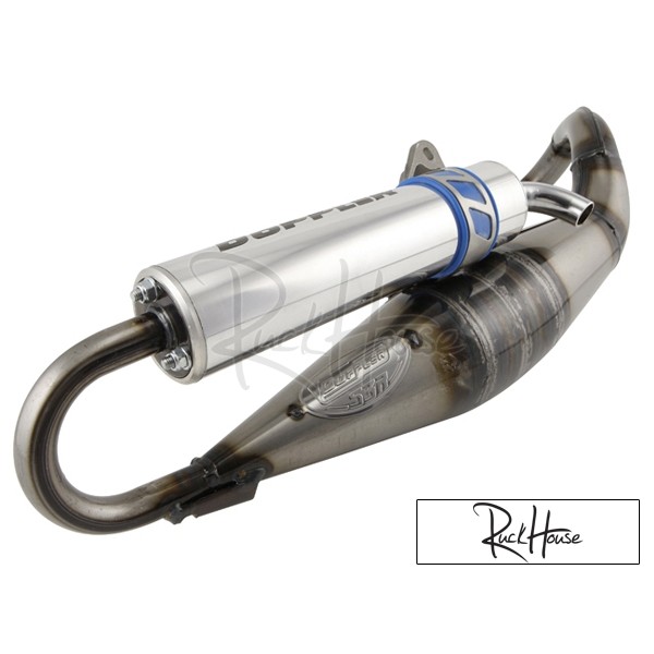 The new version of the Dopper S3R, now available with road homologation. Excellent quality – but what else do you expect from a Doppler exhaust. Clear-finished expansion chamber, beautiful polished aluminium silencer and reinforcements at the tailpipe. Works fine with 70cc sport cylinders, which is quite unusual since this exhaust is produced in France, where 70cc cylinders are not allowed to be sold. Depending on the model, one or two sets of vario weights are included.