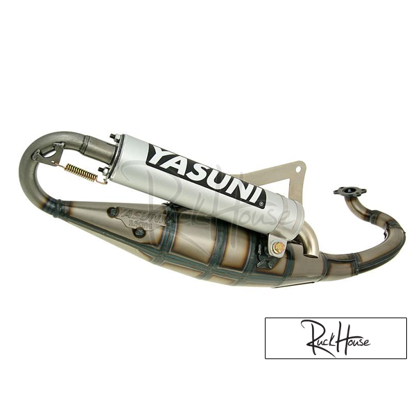 Sports exhaust system optimized for 70cc cylinders, with E-certification. Yasuni is always striving to offer the perfect product. The Yasuni R is the perfect scooter exhaust. Developed from the Yasuni Z system and perfectly adapted to 70cc sports to mid-race cylinders. A little more volume and a slightly wider cone mean greater efficiency and a more performance on these cylinders. The R works very well on 50cc engines, but it’s also great on a 70cc.This scooter exhaust system is equipped with a high-quality aluminium silencer. All necessary parts are included. Fits Peugeot engines with horizontal cylinder (not Speedfight 3) and Derbi scooter with engine. Warning! 2 different mounts for Peugeot and Derbi engines are included.