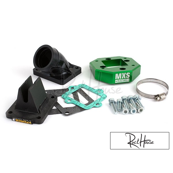This intake kit is designed to combine with the MXS GP cylinder. You can of course also associate it with Hyper Racing type configurations above 70cc. The valve box used is none other than the VForce 3 from Moto Tassinari. The pack is complete and includes the intake, the shim, the valve box, the gaskets, screws and collar.