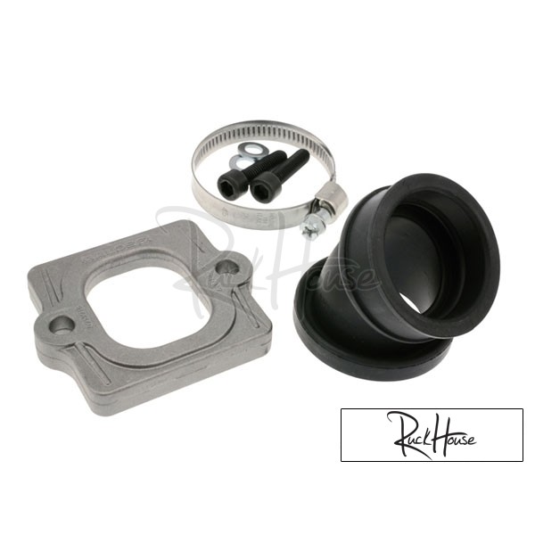 Malossi has a two-part intake manifold on offer to match the bulky Dellorto VHST carburators. This manifold consists of a base plate and a flexible, angled rubber sleeve, which will be clamped between base plate and engine intake. The inlet manifold has an internal diameter of 30mm and a connection diameter of 35mm.