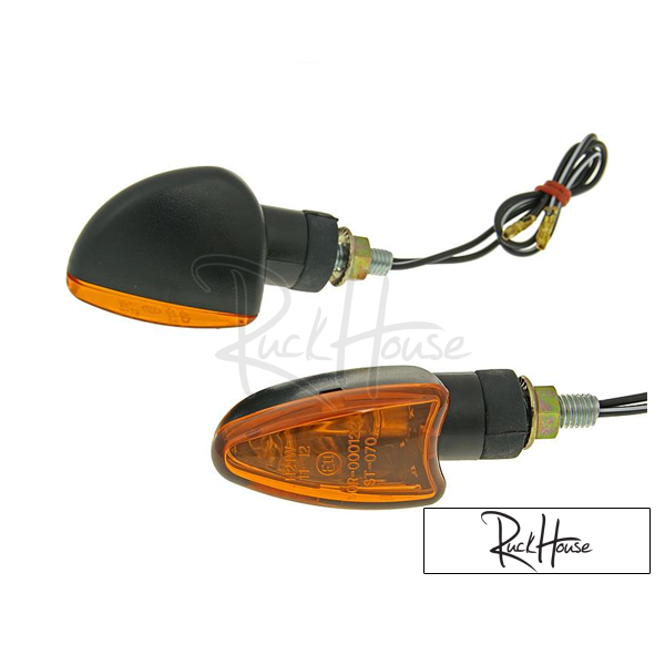 Mini indicator set universal with short stalk for motorcycles, scooters or ATVs M8 thread (fitment requires 8mm hole to be drilled). Replacement for OEM indicator of Beta RR. Set of 2 indicators, length of 68mm (short) - measured from bodywork.