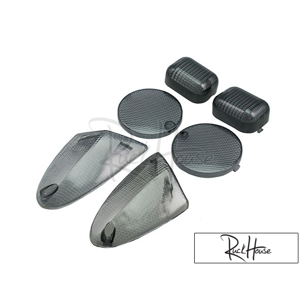 STR8 Indicator Lens Set (4) with tail light transparent black. We recommend using coloured bulbs with these lenses, red bulbs for the brake light and orange bulbs for the indicators.
