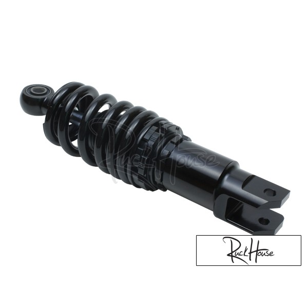 This Low Down Shock is constructed of an anodized black billet body, 550lbs/in coil, and features an adjustable length and spring pre-load. Give your scooter the aggressive stance it deserves with this black on black rear shock. This shock is extremely popular with Honda Ruckus owners that want to go as low as possible. Drop your scooter an extra 1.5in with this shock.