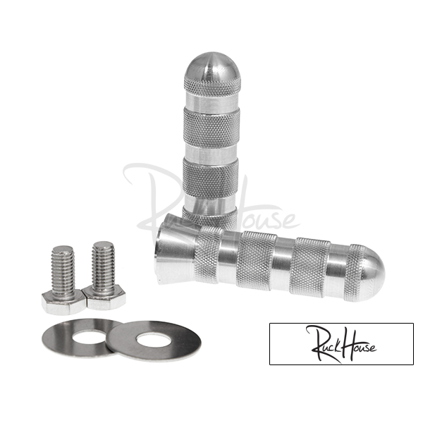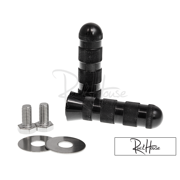 The days of BMX Bear claw foot pedals, riding a bike with no helmet, and playing tackle football with no pads on Saturday morning are long gone. Everything these days has to be revised for us. Our new design has rounded ends to help prevent boo-boos and still knurled to help with foot grip. SUPER CLEAN LOOK These foot pegs are constructed from 6061-T6 aluminum. Machined for an m10 bolt to help assist tightening the peg from the outside. All hardware included. Pegs are ANODIZED BLACK or RAW. MADE IN USA.