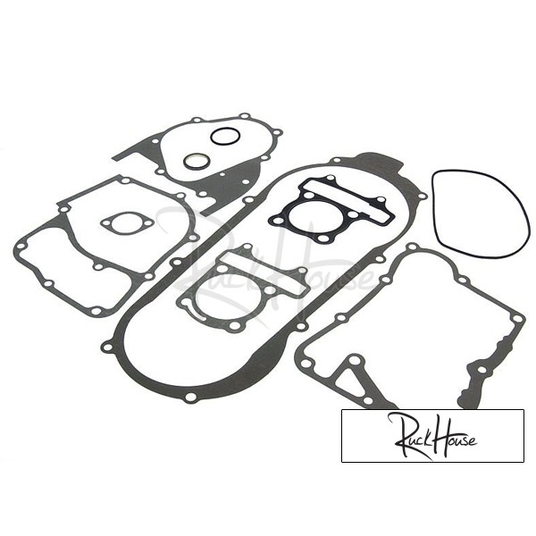 Complete engine gasket set for 125cc GY6 engines with 743mm v-belts (152QMI engines). Set contains all the servicing-relevant gaskets: a cheaper option than buying them all separately. Crank oil seals not included. We offer these as part of a crank seal set. This set can also be used on 150cc variants, but this requires you to order the 150cc head gasket; the other gaskets fit fine. The crankcase cover gasket is only for engines with 743mm v-belts. Check to ensure the correct v-belt length before ordering.