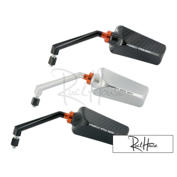 There aren't that many high-quality mirrors in F1 look on the market, but now the Stage6 Styling Department has taken care of this problem. The results are mirrors that sport an unobtrusive Stage6 logo; with real mirror glass, ball joint with wide adjustment range and in first-rate colour versions. Fitting for all scoots with M8 thread; for Peugeot models, a fitting adapter will be offered to ensure a trouble free installation.