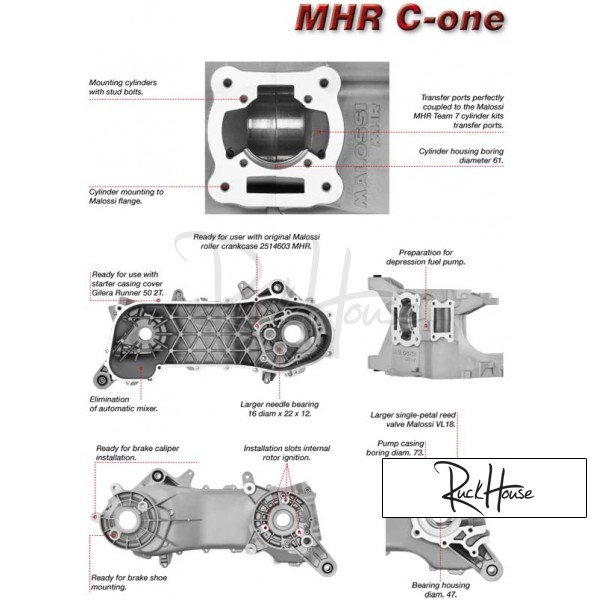 Great new for 2014! The Piaggio Crankcase Malossi C-ONE. Malossi continues to innovate and design competition parts with very strict specifications. The casing is based on Piaggio motor long type and has been optimized by the Malossi team in their italy workshops. Everything is ready to be mounted with a high racing cylinder assembly like the MHR Team. Malossi is changing the rules of the game and is once again raising the performance level for modern racing scooters. The result of extreme choices, the C-One housing marks a radical departure from the traditional structure of the scooter it is designed for and finally provides a technically advanced structure that is ready for installation of the latest generation of racing components. Until now, racing scooters could be fitted only with the original engine housing, designed to withstand a handful of horsepower and adapted to cope with the stress of competition with 70 cubic centimetre engines and about 26 horsepower. Today, on the other hand, Malossi, the innovation leader, turns the tables, proudly presenting its international public with the C-one motor housing.