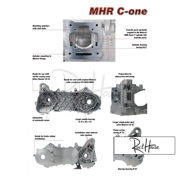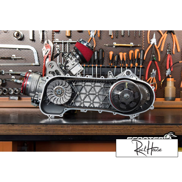The interaxle spacing has been increased, with a consequential increased stability and precision when taking curves, whereas the gearbox housing has been reduced in size by overlapping the gear wheels. The increased interaxle spacing and the internal diameter means that the starter cover designed for Piaggio scooters is required. All C-One for Yamaha housings are supplied complete with the components required for installation.