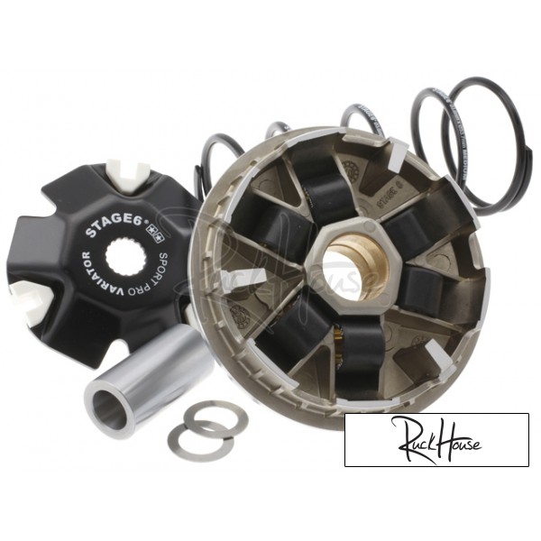 The variator comes adjusted for use with a 50cc cylinder and a Stage6 ProReplica exhaust system. It has been developed and optimised for use with Stage6 SportPro/ Streetrace or similar 70cc sport cylinders though. The back of the variator and the roller tracks are hard coated, the running surface is, however, uncoated. On the one hand, this reduces the lifespan of the running surface; on the other hand, the increased friction coefficients result in better performance. Furthermore, the coating cannot flake off, as it may happen with chrome-hardened running surfaces, which would lead to quicker wear or even breaking of the drive belt. Included in this kit are the variator with bushing, back plate with low-friction coating, shims, a set of 5.0g roller weights (16x13) and a Stage6 torque spring.