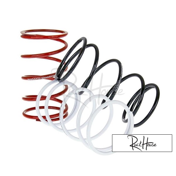 Naraku Sports Contra Spring V.2 Pack, +1000, +1500, +2000 rpm. The current version of the Naraku counter pressure spring uses a modified alloy spring providing better resilience and above average strength. Torque springs are available in packs of 2 or 3 or are available to purchase individually. Replacing the spring is necessary when tuning engines, the idea is to prevent the initial response from the variator therefore increasing the engine speed, the the increase power with delayed engagement will increase the power at pull off. Markings on the spring help you identify the strength of the spring for example, a spring marked 2000 RPM will delay the reaction by 2000 RPM. The greater RPM spring will provide you with the greater power.