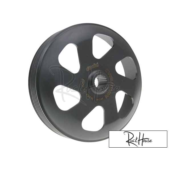 Cloche d'embrayage Maxi Speed de la gamme Polini Evolution pour les maxi scooters Piaggio 125-300cc. La cloche d’embrayage est usinée CNC en une seule pièce, de sorte que la cloche tourne à 100% sans à-coups et ne nécessite pas d’équilibrage. La cloche a de très grandes ouvertures de ventilation qui réduisent à nouveau la température et donnent à l'embrayage un look agressif. Globalement, une cloche d’embrayage très performante dans la gamme haut de gamme est de très bonne qualité de fabrication.