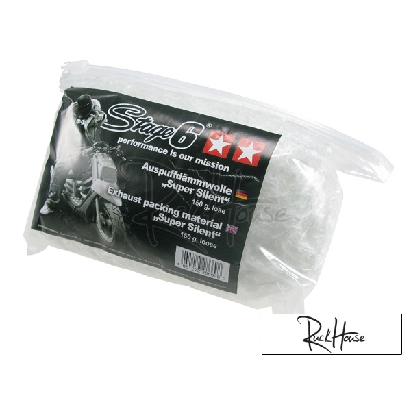 Le matériau d’emballage Super-Silent de Stage6 est une laine d’emballage de course de haute qualité, qui présente de grandes propriétés d’amortissement et de résistance à la température. Pour la réduction du bruit et la longévité du matériau d’emballage, la quantité (et donc la densité) a une importance primordiale. La laine ne vient pas comme un tapis ferme, vous pouvez donc extraire exactement la quantité de laine dont vous avez besoin et l'emballage du silencieux est plus facile. Remarque: si la laine n'est pas assez dense: au début, l'échappement est silencieux, mais le matériau d'emballage se remet rapidement en place, ce qui crée un espace vide. le silencieux est à nouveau bruyant et le matériau s'use excessivement. Si la laine est trop dense: durée de vie plus longue de la laine, mais réduction du bruit insuffisante. Attention: Ne pas trop envelopper la laine. Lorsque la boîte est complètement remplie, il devrait encore être possible de rapprocher le matériau de 2 à 3 cm, c’est-à-dire qu’il devrait y avoir un peu de jeu dans le silencieux! Remettez le capuchon en place. les espaces entre le capuchon et le corps du silencieux peuvent être obturés à l'aide de silicone résistant à la chaleur. 150 g, en vrac (assez pour un silencieux sport scooter!)