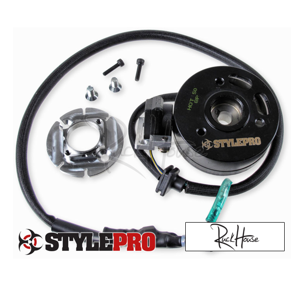 Allumage Racing de STYLEPRO avec alimentation. Le volant d'inertie a été considérablement réduit dans cet allumage et ne pèse que 407g au lieu de 700g. Grâce au gain de poids de 300 g, le moteur doit tourner plus librement et tourne beaucoup plus vite. La synchronisation de l'allumage est réglable et doit être réglée entre 1,2 et 1,4 mm avant PMH (selon la configuration du moteur). Attention: Lors du montage, il est essentiel de s’assurer que la plaque d’armature est correctement montée et parfaitement alignée. De plus, des rondelles supplémentaires doivent être utilisées lors du montage de la broche d'entraînement sur le champ principal pour la série de pompes à eau, afin que les bobines d'induit ne soient pas endommagées par le filetage