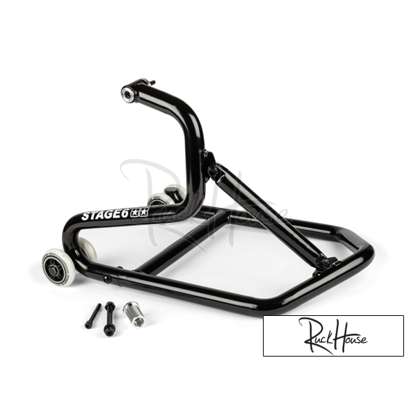 Béquille d'atelier (Béquille d'atelier) Stage6 MK3 pour Piaggio / Minarelli / Peugeot. La béquille Stage6 a été à nouveau révisée, cette fois l'accent principal lors du développement de la prochaine génération a été mis sur la stabilité et la précision pour rendre la béquille encore plus robuste, durable et résistante. Les logos sur les pneus blancs ont été relookés et il y a désormais également un logo Stage6 sur les chambres à air. Lors des courses, foires, salons personnalisés et autres événements, les gens aiment se passer de la tribune principale ; permettent de soulever le véhicule pour la présentation ou l'entretien et sont un véritable must pour l'utilisation de chauffe-pneus. Le MK3 est fabriqué à partir de tubes robustes avec un revêtement noir. Quatre roues facilitent le levage du véhicule. La béquille d'atelier se connecte au support d'amortisseur et non au capot moteur, de sorte qu'un montage et un démontage fastidieux ne sont pas nécessaires. La béquille d'atelier a été développée et testée pour Piaggio Zip, Gilera Runner, Yamaha Aerox, Aprilia SR et Peugeot Speedfight. Il est livré avec 3 supports pour Piaggio, Minarelli long et Peugeot, mais peut également être utilisé sur tous les moteurs avec support amortisseur de 8 ou 10mm.