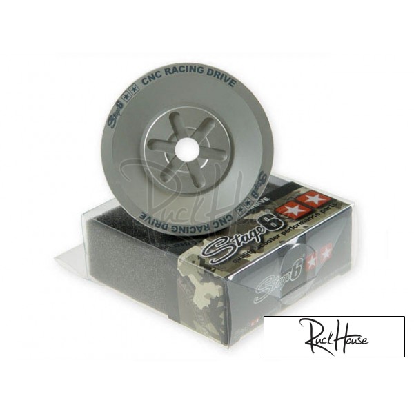 Afin de limiter les coûts, les poulie de course d'origine sont généralement en acier embouti. Lorsque ces pièces se refroidissent après la coulée, le métal est encore en fusion et les angles entraînement peut souvent varier. En raison du fait que les moteurs de course ont une bande de puissance très étroite, ces tolérances ont des conséquences directes sur la puissance de sortie. Contrairement à ces versions standard, l'entraînement de course Stage6 est précisément découpe au CNC a partir de matériaux solides. En tout, plus de douze versions différentes ont été testées pour trouver les meilleure alliages et angle. Le revêtement de surface spécial utilisé dans cette poulie font en sorte que les ailettes de refroidissement sont inutile. La masse réduite a bien sûr aussi des résultats positifs pour la puissance à la roue arrière. Cette pièce de course a été effectivement mis au point pour les courses de drag, mais Freddy Koopmans également les a utiliser avec son scooters de compétition pour la saison 2004.